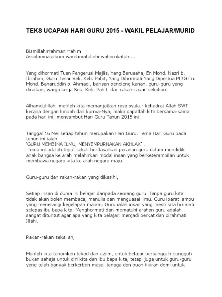 Ucapan wakil pelajar sempena hari guru 2021 #bergurudemiilmubinagenerasibaharu. Teks ucapan hari guru oleh wakil murid. Teks ucapan wakil pelajar sempena sambutan hari gurubismilahhirahmanirahim. Salam sejahtera saya ucapkan kepada. Cikgu sarifah nurul najihah bt sy ab hamid.
